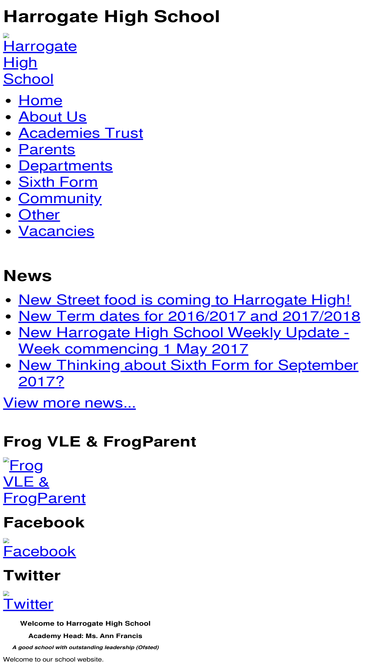 80%harrogate high school is a thriving 11-19 secondary school to the north east of harrogate with approximately 730 students. our vision is based upon our school motto of ´learning first’. we work together to raise the achievement of all students, improving their life chances and embedding their ambition. this is our moral purpose! we are large enough to provide a broad and balanced education, but small enough to give personal attention and care to all of our students.