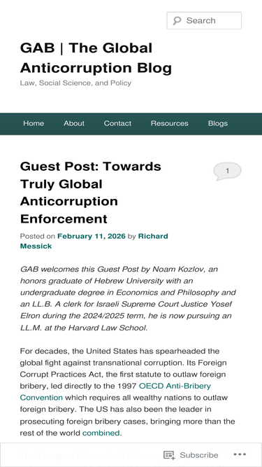 100%The Global Anticorruption Blog is devoted to promoting analysis and discussion of the problem of corruption around the world. This blog is intended to provide a forum for exchanging information and…