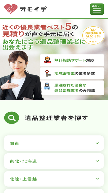 100%お近くの優良な遺品整理業者ベスト5社の無料お見積りが直ぐ手元に届きます。1社1社に連絡するのが手間な方は一括で無料お見積りを依頼できる【オモイデ】にご連絡を。あなたに合う遺品整理業者に出会えます。