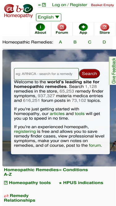 100%complete homeopathic remedies site. with forum, directory, comprehensive homeopathic remedy store with materia medica, and homeopathic remedy finder app which suggests homeopathic remedies from over 64,000 symptoms and 650 remedies
