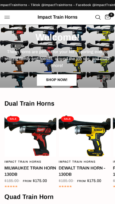 Experience the power of an extreme, high-quality train horn from Impact Train Horns. Offering 9 different tool brands. DeWalt Air Horn, Milwaukee Air Horn, Ryobi Air Horn, Ridgid Air Horn. Free Shipping. 1-year warranty. Next-Day Shipping.