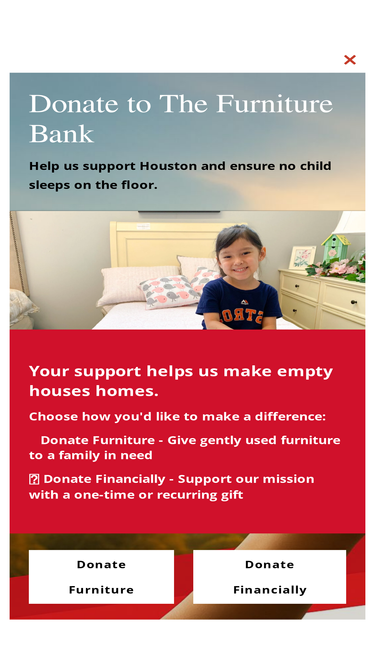 77%Donate gently used furniture to The Furniture Bank and help provide essential furnishings to families in need across Houston.