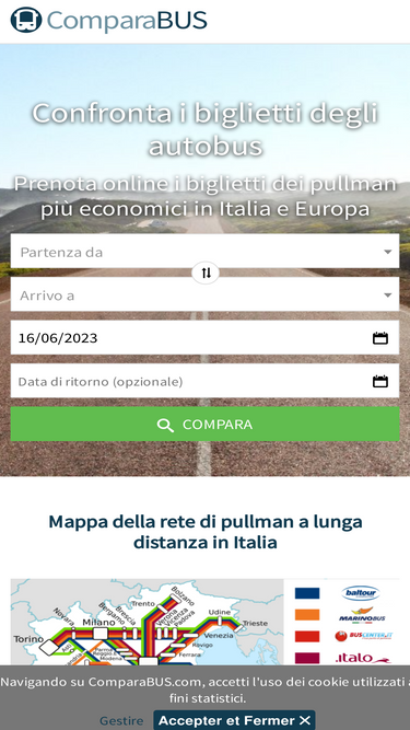 64%prenota i biglietti dei pullman più economici! oltre 2.500 destinazioni in italia. confronta le compagnie di autobus, gli orari e i prezzi delle tratte dei pullman. comparabus.com, motore di ricerca per: pullman, treno, aereo e carpooling.