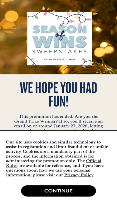 79%NO PURCH. NEC. 50 U.S. (DC&PR), 18+. Ends 12/31/25. See Rules. ‘Tis the season for chances to win! Play daily for chances to win an American Eagle eGift Card instantly and you could even win a sweepstakes prize up to $10,000!