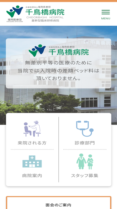 100%千鳥橋病院は福岡市博多区にある24時間365日急患に対応している総合病院です。当院では差額ベッド料はいただいておりません。また無料低額診療を実施しております。
