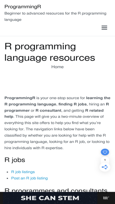 68%ProgrammingR is your one-stop source for learning the R programming language, finding R jobs, hiring R programmers or R consultants, and getting R related help.