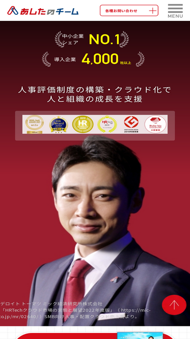 64%導入企業4000社・シェアNo.1。業種・企業規模を問わず実績多数。 あしたのチームは、人事評価業務のクラウド化から、評価制度の構築、運用までを徹底サポート。AIを搭載した「あしたのクラウド™」は従業員の目標設定、人事担当者の評価、給与決定、通知まで一気通貫。人事評価業務の圧倒的な効率化を実現します。顔写真機能も搭載。