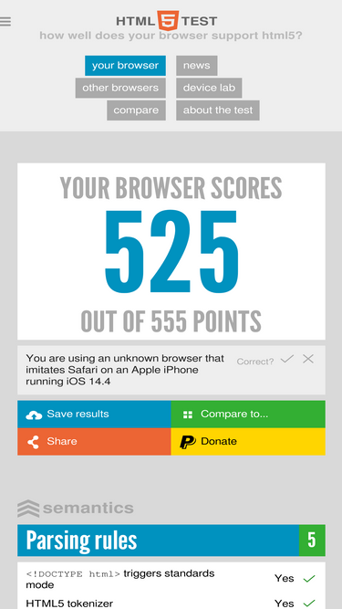 100%The HTML5 test score is an indication of how well your browser supports the upcoming HTML5 standard and related specifications. How well does your browser support HTML5?