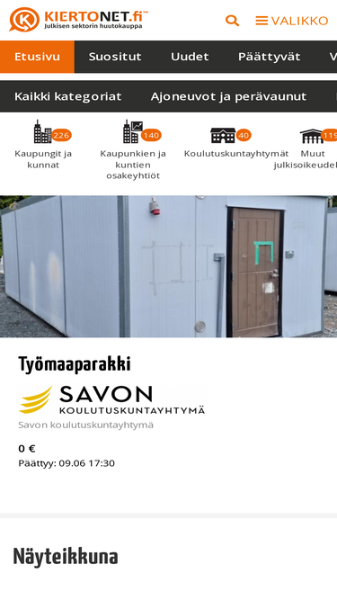 79%Kiertonet.fi on julkisen sektorin omaisuuden myyntikanava - julkisen tavaran kauppapaikka. Kunnat, kaupungit, pelastuslaitokset, valtion virastot, seurakunnat sekä muu julkinen sektori myy nettihuutokaupalla – ostaa voi kuka tahansa!