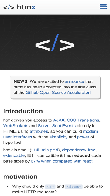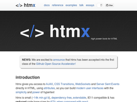 htmx gives you access to ajax, css transitions, websockets and server sent events directly in html, using attributes, so you can build modern user interfaces with the simplicity and power of hypertext htmx is small (~14k min.gz’d), dependency-free, extendable, ie11 compatible & has reduced code base sizes by 67% when compared with react