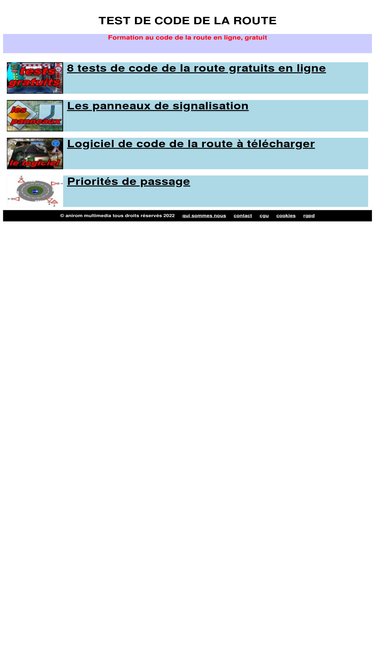 séries de tests de code de la route gratuits en ligne, avec informations supplémentaires sur les panneaux de signalisation routière et le permis de conduire français.