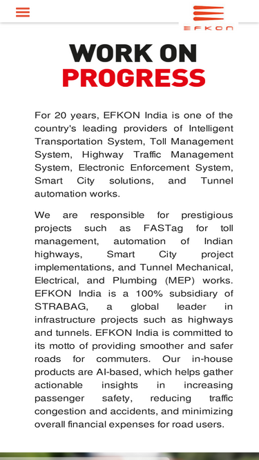 Company Profile Management EFKON Group Management System Business Compliance History Corporate Social Responsibility (CSR) EFKON STRABAG Company Profile For more than twenty years, EFKON STRABAG India has distinguished itself as a leading provider of state-of-the-art SMART SOLUTIONS, specializing in Intelligent Transportation Systems, Electrical & Mechanical Systems, and Construction services across highways, urban areas, bridges, tunnels, […]