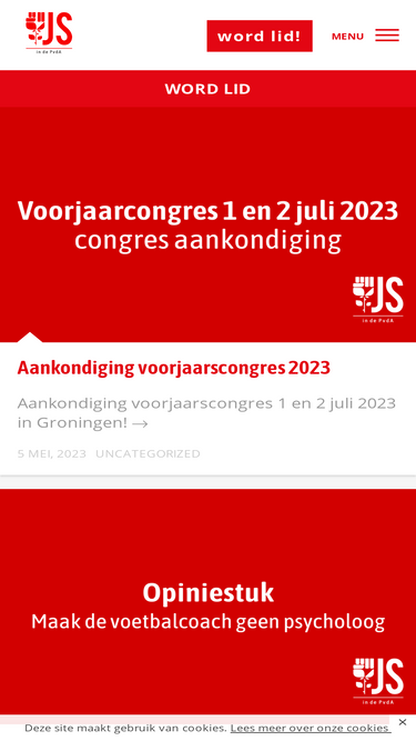 74%De Jonge Socialisten in de PvdA (JS) is een Nederlandse politieke jongerenorganisatie. Politiek onafhankelijk, maar verbonden aan de PvdA.