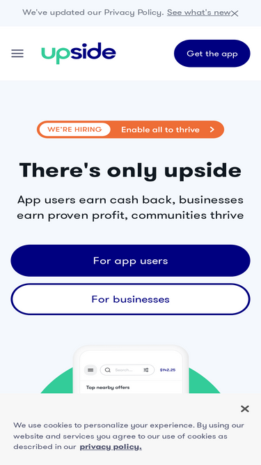 80%GetUpside is a free app that gives you real cash back on your everyday purchases. Find great offers at 45,000 businesses nationwide, including all the big gas brands and your favorite local restaurants and grocery stores.