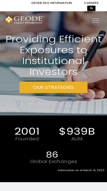 92%Geode was founded in 2001 and set out to create structured and repeatable investment strategies with the objective of providing efficient exposures to institutional investors. Today, our business benefits from the strength of our systematic discipline and allows us to offer investment solutions across target risk levels and asset classes.