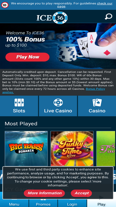 79%ICE36 accepts a number of payment methods to fund your online casino account. Have a look at the available options to deposit and withdraw money. 18+. Play Responsibly