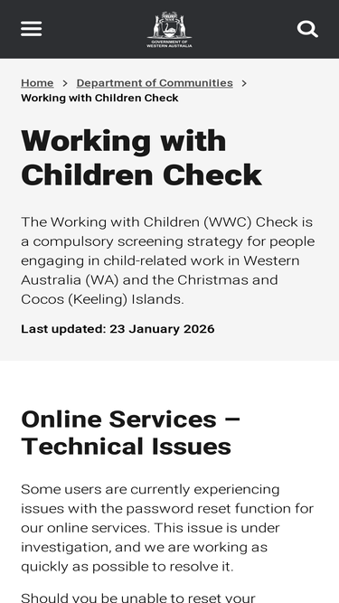 68%The Working with Children (WWC) Check is a compulsory screening strategy for people engaging in child-related work in Western Australia (WA) and the Christmas and Cocos (Keeling) Islands.