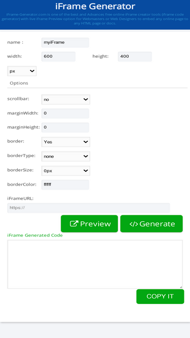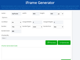 Generate iframe code online to embed any HTML doc or page to any website or blog with live preview options and customizations