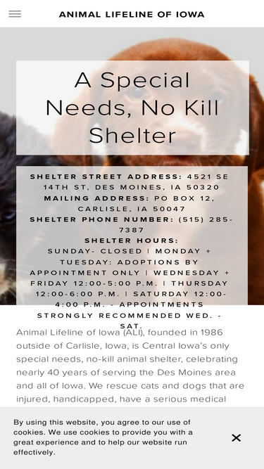 84%Shelter Street Address: 4521 SE 14th St, Des Moines, IA 50320 Mailing address: PO Box 12, Carlisle, IA 50047 Shelter Phone Number: (515) 285-7387 Shelter Hours: Sunday - Tuesday: CLOSED | Wednesday + Friday 12:00-5:00 p.m. | Thursday 12:00-6:00 p.m. | Saturday 12:00-4:00 p.m.