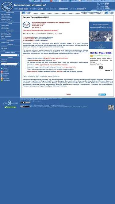 82%international journal of innovation and applied studies (ijias) is a peer reviewed multidisciplinary international journal publishing original and high-quality articles covering a wide range of topics in engineering, science and technology. ijias is an open access journal that publishes papers submitted in english, but also in french, spanish and arabic. it is published four times per year. the journal aims to give its contribution for enhancement of research studies and be a recognized forum attracting authors and audiences from both the academic and industrial communities interested in state-of-the art research activities in innovation and applied science areas. the journal welcomes author submission of original and significant contributions. contributions should not have been previously published nor be currently under consideration for publication elsewhere. all research articles, review articles, short communications and technical notes are pre-reviewed by the editor, and if appropriate, sent for blind peer review. the editor asks the opinion of three referees who are experts in the relevant field of research. authors have to read through the author guidelines carefully before beginning the submission process: articles are accepted only in ms-word format. no pdf files are accepted. please submit your article in only one file. submitted papers should strictly follow the format of the sample article. papers can be written in english, french, spanish or arabic. if the manuscript is in a language other than english, it should include an english version of the title. the submitted article should include the name(s) and the affiliation(s) of the author(s). each manuscript must include an abstract in english of approximately 150 words. there is no submission or publication fee. if you have any questions please send an email to contact the editorial office. ijias would take much care in making your article published with a very fast and without delay review procedure (