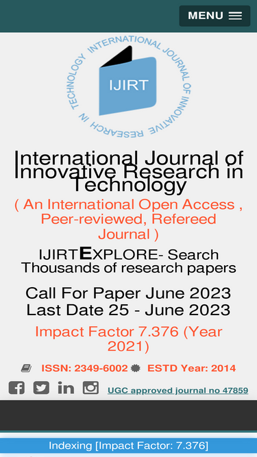 78%International Journal for Innovative Research in Technology is UGC Compliant Peer reviewed Journal. International Open Access Journal. Impact Factor 8.017