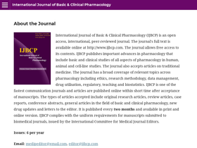 71%international journal of basic & clinical pharmacology (ijbcp) is an open access, international, peer-reviewed journal. the journal's full text is available online at http://www.ijbcp.com. the journal allows free access to its contents. ijbcp publishes important advances in pharmacology that include basic and clinical studies of all aspects of pharmacology in human, animal and cell-line studies. the journal also accepts articles on traditional medicine. the journal has a broad coverage of relevant topics across pharmacology including ethics, research methodology, data management, drug utilisation, regulatory, teaching and biostatistics. ijbcp is one of the fastest communication journals and articles are published online within short time after acceptance of manuscripts. the types of articles accepted include original research articles, review articles, case reports, conference abstracts, general articles in the field of basic and clinical pharmacology, new drug updates and letters to the editor. it is published monthly and available in print and online version. ijbcp complies with the uniform requirements for manuscripts submitted to biomedical journals, issued by the international committee for medical journal editors.
