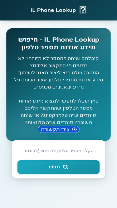 שירות מי התקשר אלי חיפוש אנשים לפי מספר טלפון. מגוון אנשי קשר בישראל יותר מ 2,404,994 טלפונים ואנשי קשר.