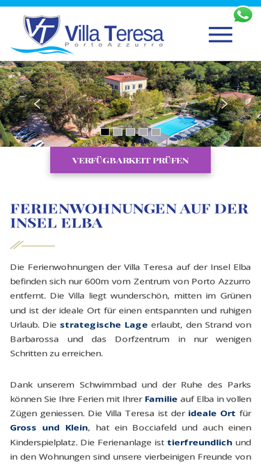 100%Kontakte der Residenz Villa Teresa: Reservierungen und Verfügbarkeit. Um zu buchen, nutzen Sie unser Online-Buchungssystem. Wir erwarten Sie in unserer Residenz in Porto Azzurro, auf der Insel Elba.