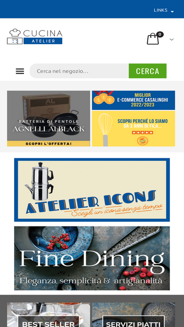 97%Cucina Atelier è lo shop di attrezzatura da cucina dove trovi Seltmann, Churchill, Schott Zwiesel, Bormioli Rocco, Tognana. Servizi di piatti e di bicchieri, posate, pentole in alluminio e pentole Agnelli. Consegna gratuita sopra i 129€