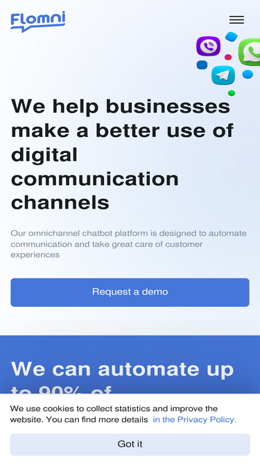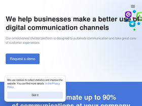 80%our omnichannel chatbot platform is designed to automate communication and take good care of customer experience. we can automate up to 90% of all communications at your company.