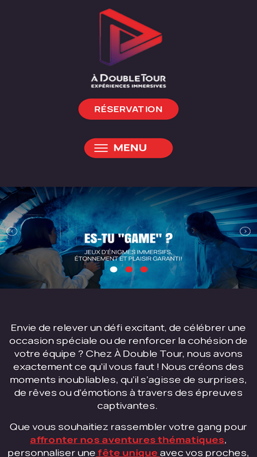79%https://www.youtube.com/watch?v=zR1CF1Lz_oU Envie de relever un défi passionnant, de célébrer une occasion spéciale ou de renforcer la cohésion de votre équipe ? Chez À Double Tour, nous avons exactement ce qu’il vous faut ! Nous créons des moments inoubliables, qu’il s’agisse de surprises, de rêves ou d’émotions à travers des épreuves captivantes. Que vous souhaitiez rassembler […]