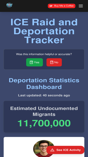 91%Track ICE raids, deportations, and immigration enforcement activities across the United States. Updated hourly with statistics on detentions, arrests, and deportations.