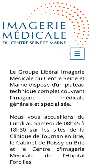 100%Le Groupe Imagerie Médicale du Centre Seine et Marne dispose d’un plateau technique complet couvrant l'imagerie médicale générale et spécialisée (Scanner, IRM, Radiologie et Echographie). Nous vous accueillons du Lundi au Samedi sur la Clinique de Tournan, le Cabinet de Roissy en Brie et l'Hopital Forcilles.