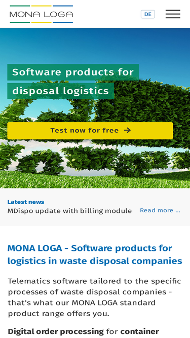 76%MONA LOGA ist die moderne Lösung für Logistik und Entsorgung. Mit Auftragsbearbeitung, Disposition von Fahraufträgen zu Touren, Behältermanagement, Fahrzeug- und Telematiksysteme, mobile Apps für alle Bereiche. Digitalisierung und Automatisierung von Entsorgungsprozessen