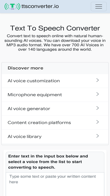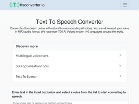 61%TTSConverter.io is a top website for Text-to-Speech (TTS) services, enabling fast and effortless conversion of text to speech. It offers advanced technology and a user-friendly interface, making it ideal for individuals and businesses to create high-quality audio files.