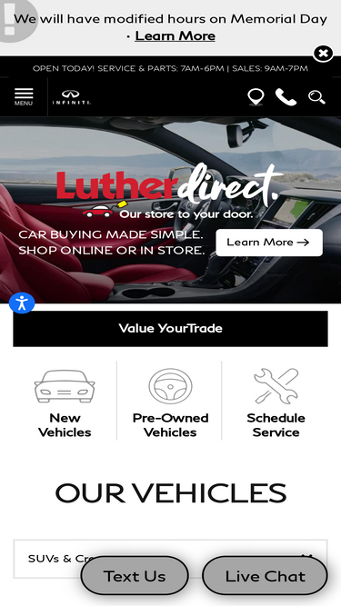 98%at luther infiniti of bloomington, our goal is to provide you a car buying experience that's fun and simple. our staff and wide inventory are waiting for you! visit our car dealership in bloomington today!