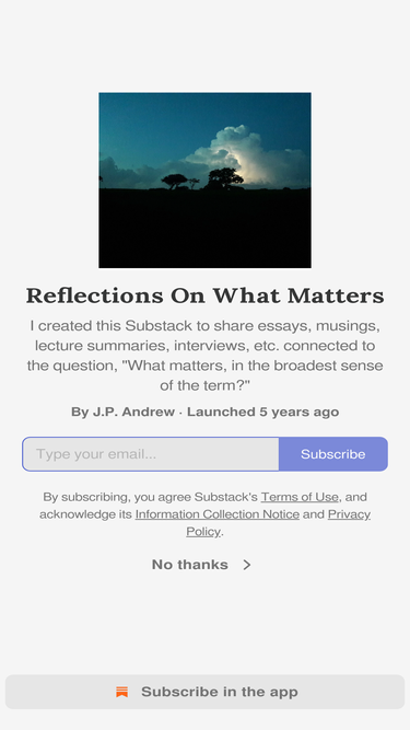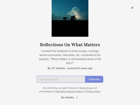 61%I created this Substack to share essays, musings, lecture summaries, interviews, etc. connected to the question, "What matters, in the broadest sense of the term?". Click to read Reflections On What Matters, a Substack publication with hundreds of subscribers.
