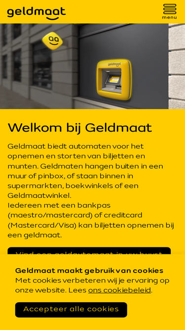 85%Geldmaat - Wil je contant geld opnemen of storten? Je kan door heel Nederland terecht bij onze gele geldautomaten. Kijk op onze locatiewijzer voor een automaat bij jou in de buurt.