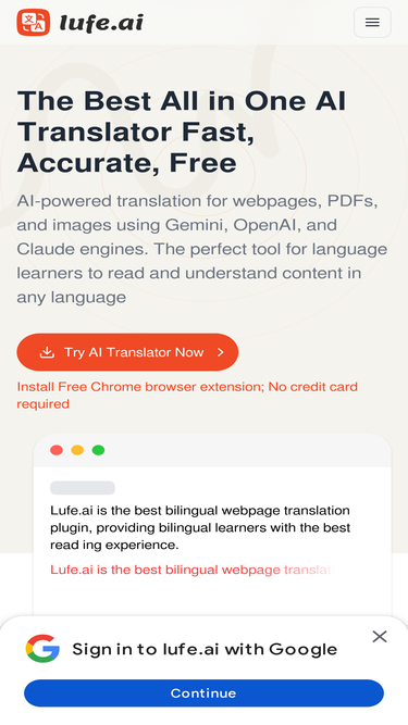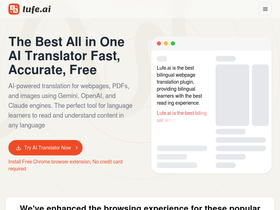 76%Lufe AI Übersetzer ist eine KI-gestützte zweisprachige Web-Übersetzungserweiterung, die zweisprachige Übersetzung, Wortauswahl-Übersetzung, Bild-Übersetzung, PDF-Übersetzung und mehr bietet