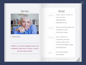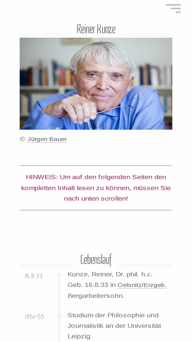 100%Internetseite des Schriftstellers Reiner Kunze. Diese Seiten enthalten die wichtigsten Informationen zu Reiner Kunze. Der Lebenslauf (Vita), die Werke und Auszeichnungen des Autors sowie die Kunze-Stiftung sind Thema dieser Webseite.