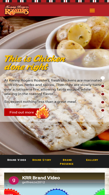59%kenny rogers roasters is a casual dining restaurant with rotisserie-roasted chicken as its main core item complemented by a rich variety of hot and cold side dishes. this is made up of kenny rogers roasters famous homemade muffins, jacket potatoes, vegetable salads, pastas, soups, desserts and beverages served in a friendly and comfortable environment.
