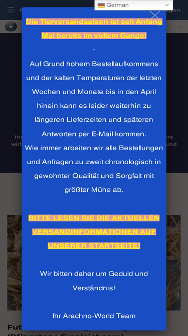 97%infobox! update 20.08.23. in der kommenden woche wird es in weiten teilen deutschlands zu heiß um tiere zu versenden. wir bitten um ihr verständnis das wir diese bestellungen aufschieben müssen bis wir wieder geeignete temperaturen erreicht haben. vielen dank und eine schöne woche. . update 14.08.23. dhl hatte im frühjahr angekündigt das es wegen umstellung zu problemen mit der sendungsverfolgung