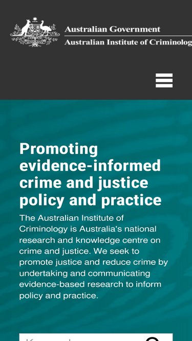 100%the australian institute of criminology is australia's national research and knowledge centre on crime and justice. we seek to promote justice and reduce crime by undertaking and communicating evidence-based research to inform policy and practice.