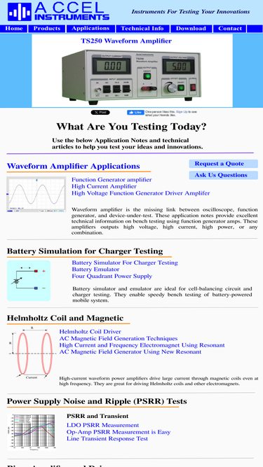accel instruments - instruments for testing your innovation. we design and manufacture innovated test equipment for general lab bench testing. our feature products are ideal for power electronic test and measurements. the ts250 is a waveform amplifier, the ts200 is a modulated power supply. these instruments are ideal for function generator amplifier, ldo psrr testing, battery simulator, lab amp, step response tests, cmrr tests, and more.