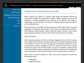 99%providing merger and acquisition advisory services to mid-market companies, with an industry focus in the accounts receivable management area. marion’s services include business valuation, succession planning, business sales and other services for business buyers and sellers. industry experience includes financial services, healthcare services, telecommunication, and various other outsourcing companies.