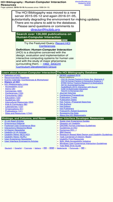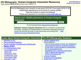 80%the hci bibliography (hcibib) is a free-access bibliography on human-computer interaction, with over 100,000 records in a searchable database. hcibib.org is also one of the premier portals to high-quality information on the development of usable software and web-based systems.