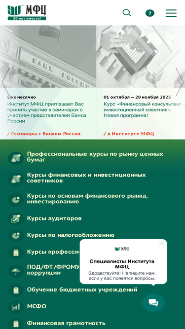 89%Добро пожаловать на сайт Образовательного центра МФЦ (в группу входят: Институт МФЦ, Учебный центр МФЦ, Экзаменационный центр, Консалтинг). Мы специализируемся в обучении и повышении квалификации участников финансового рынка, развиваем образовательные программы в сфере бухгалтерского учета, налогообложения и налогового консультирования, финансового анализа и управления, аудита, МСФО, внутреннего контроля, финансового мониторинга, а также финансовой грамотности, государственных (муниципальных) и иных регламентированных закупок, и многих других направлений обучения.