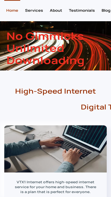 100%No Gimmicks Unlimited Downloading Customer FAQ No ContractsNo Pricing Tricks Internet &Digital Telephone High-Speed Internet Digital Telephone VTX1 Internet offers high-speed internet service for your home and business. There is a plan that is perfect for everyone. Get rid of that expensive local telephone service from AT&T or Verizon! Bundle for MORE savings! VTX1 Internet […]