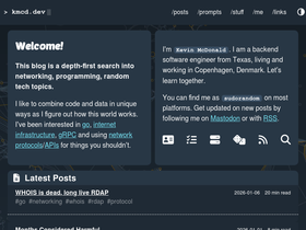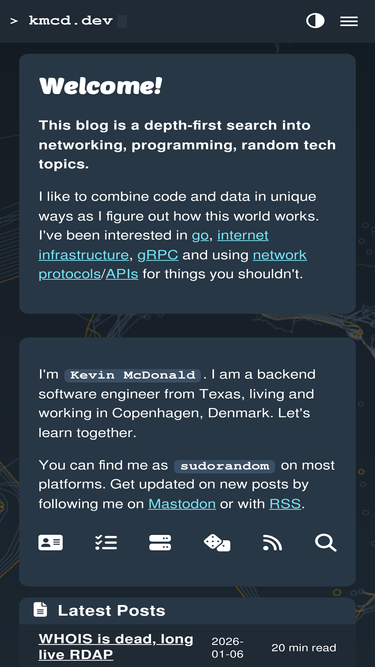 83%Welcome! This blog is a depth-first search into networking, programming, random tech topics. I like to combine code and data in unique ways as I figure out how this world works. I've been interested in go, internet infrastructure, gRPC and using network protocols/APIs for things you shouldn't. I'm Kevin McDonald. I am a backend software engineer from Texas, living and working in Copenhagen, Denmark. Let's learn together. You can find me as sudorandom on most platforms. Get updated on new posts by following me on Mastodon or with RSS.