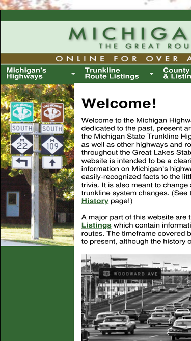 87%dedicated to the past, present and future of the michigan state trunkline highway system as well as other highways and routes throughout the great lakes state. this website is intended to be a clearinghouse of information on michigan's highways, from easily-recognized facts to the little-known trivia. it is also meant to change as the state trunkline system changes.